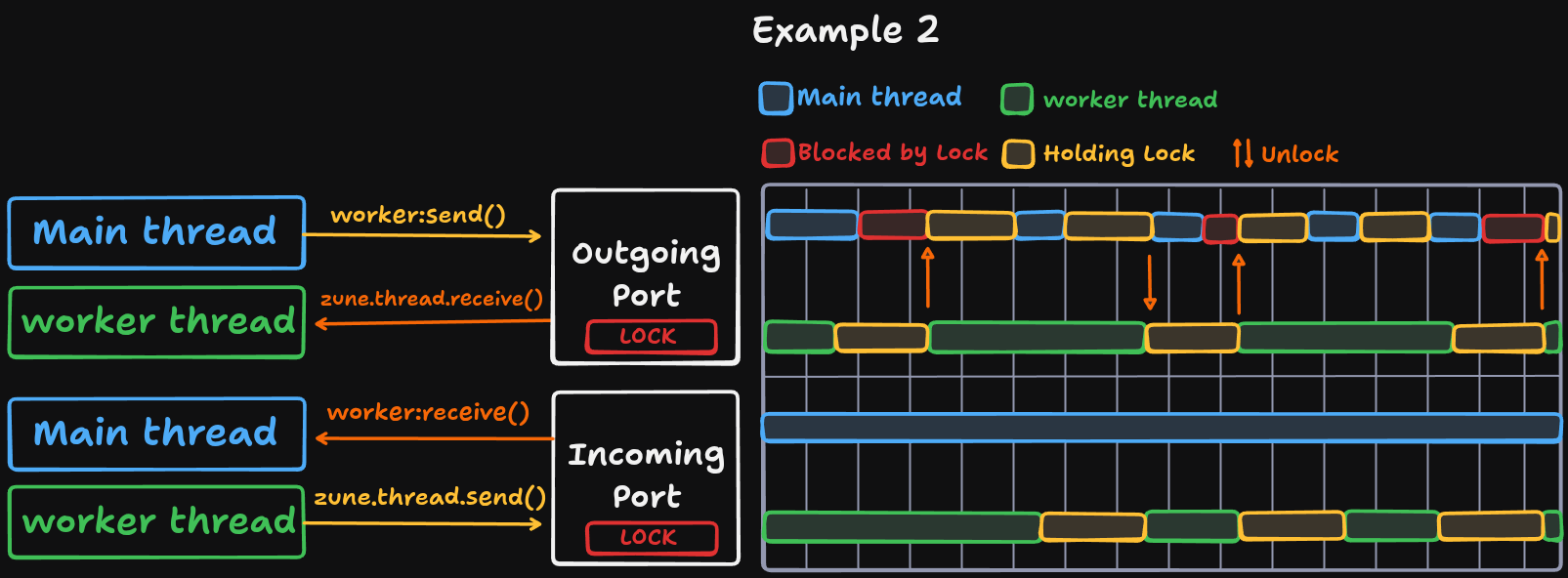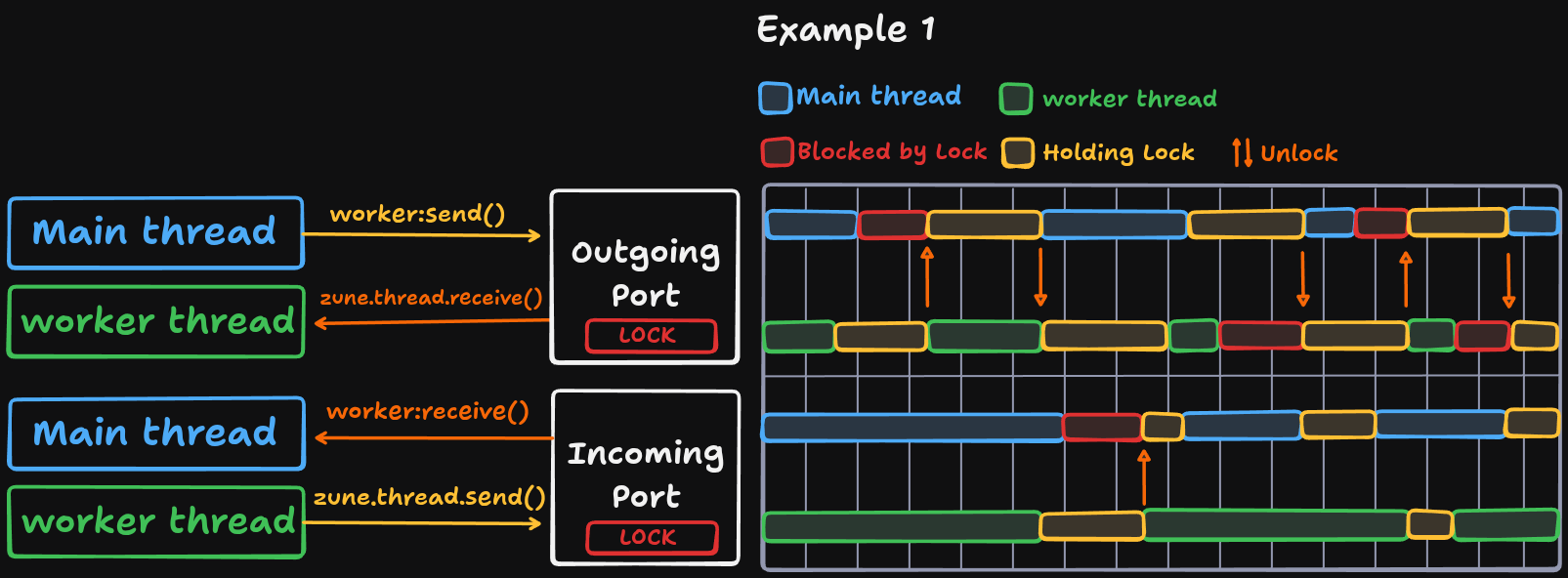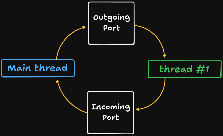 Below is a diagram on how the runtime manages messages between threads; the outgoing and incoming “ports” are basically like tunnels. Internally, it’s just a queue with mutex locks.